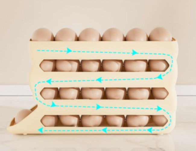 独創的なスライド式デザインで、卵を入れると自然にロールして整理され!取るときは一番手前に滑り出るので、無理に手を伸ばす必要がなく、老若男女に使いやすい。