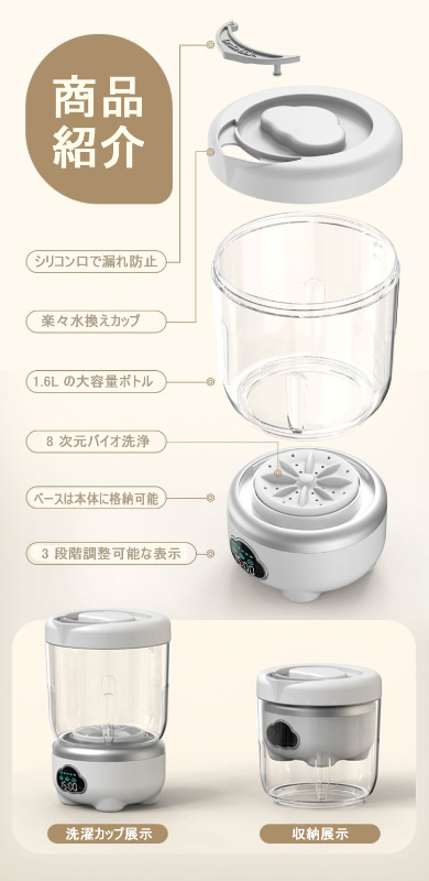 ワイヤレスミニ洗濯機、洗濯カップ、1.6L 全自動、3段階の洗浄力、下着専用ポータブル洗濯機、軽量で持ち運びに便利