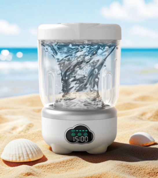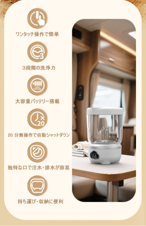 「どこでも楽々キレイ」は、下着や靴下などのデリケートな衣類を、いつでもどこでも手軽に洗えるミニ洗濯機です。面倒な工事は一切不要!ワイヤレス設計なので、コンセントがない場所でも使用可能です。