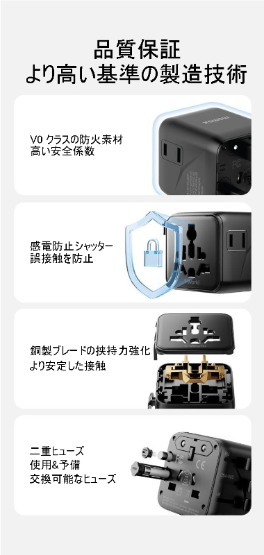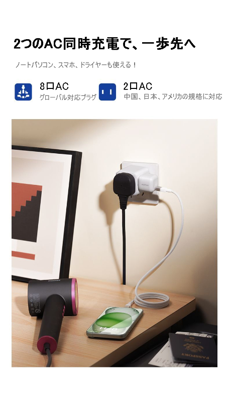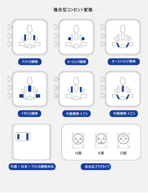 ヨーロッパ、アメリカ、イギリス、日本、韓国、タイなど、様々な地域のコンセントに対応した変換プラグとグローバルコンセントです。これさえあれば、海外旅行中に充電の心配なし!コンパクトで持ち運びにも便利です。